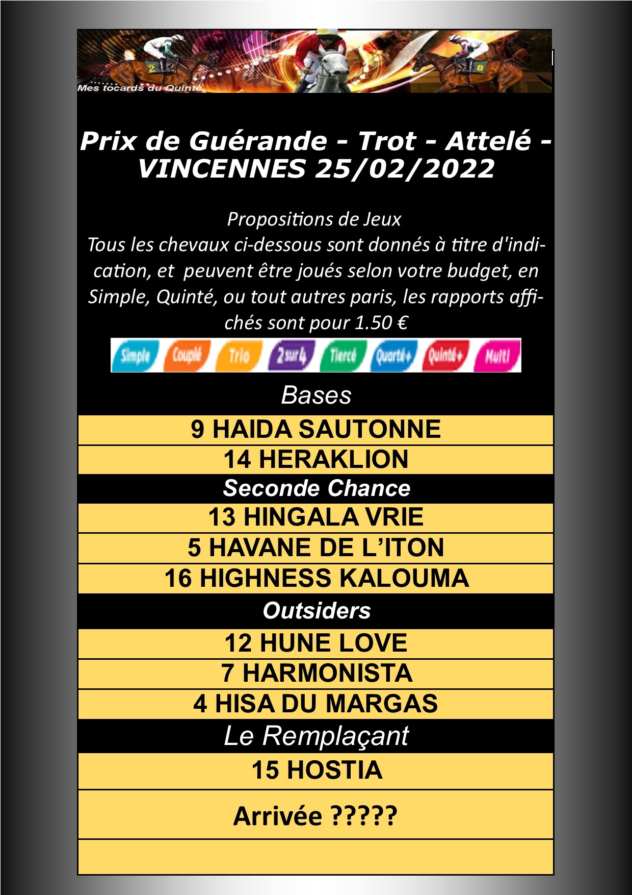 de Guérande - Trot - Attelé - VINCENNES 25/02/2022 13h50 - Prix de Guérande - Trot - Attelé - 2850m - 44000 € - 16 Partants Femelles - Course C - Pour juments de 5 ans (H), n'ayant pas gagné 81.000€ Grande piste - Mâchefer - Corde à gauche Terrain : Bon |