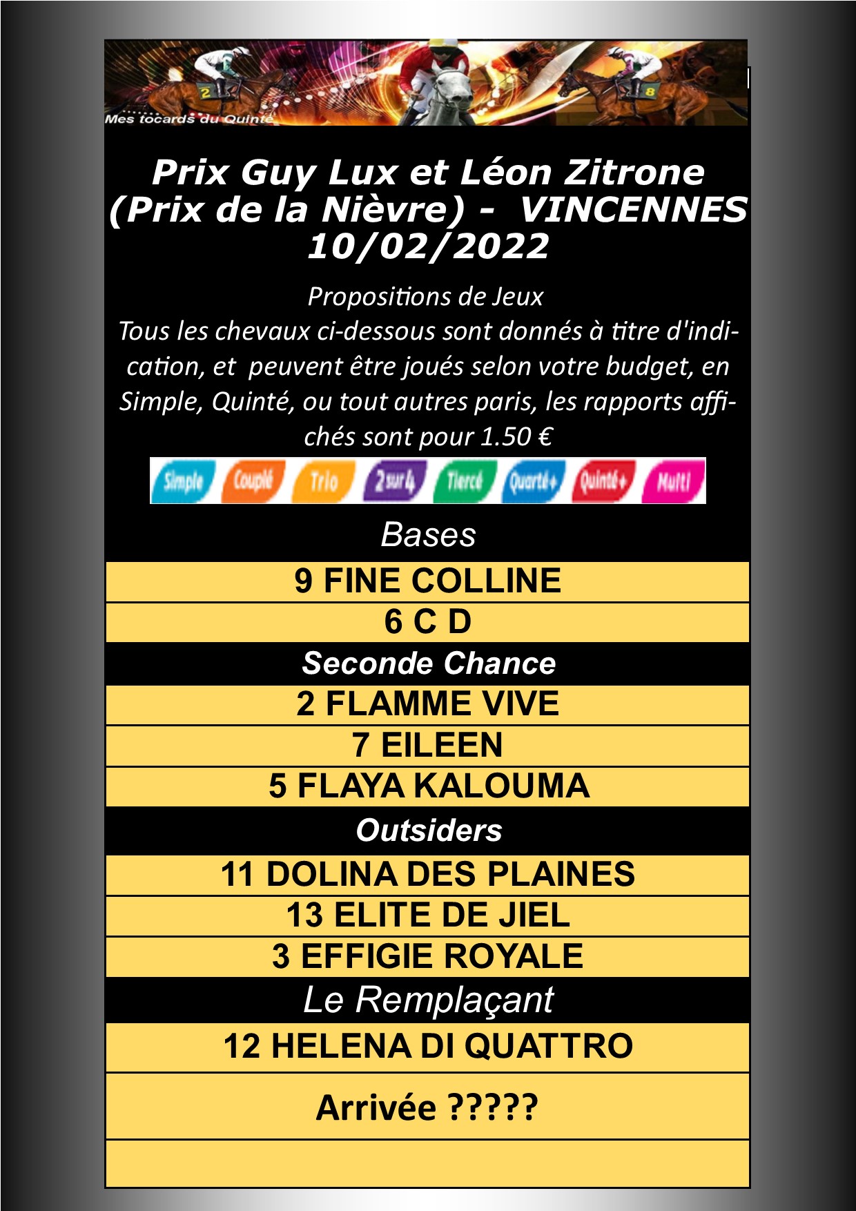 | Quinté+ Prix Guy Lux et Léon Zitrone (Prix de la Nièvre) - VINCENNES 10/02/2022 13h50 - Prix Guy Lux et Léon Zitrone (Prix de la Nièvre) Attelé - 2700m - 75000 € - 13 Partants Course Européenne - Course B - Femelles - Pour juments de 7 à 11 ans inclus (F à B), n'ayant pas gagné 341.000 €. - Grande piste - Mâchefer - Corde à gauche. |