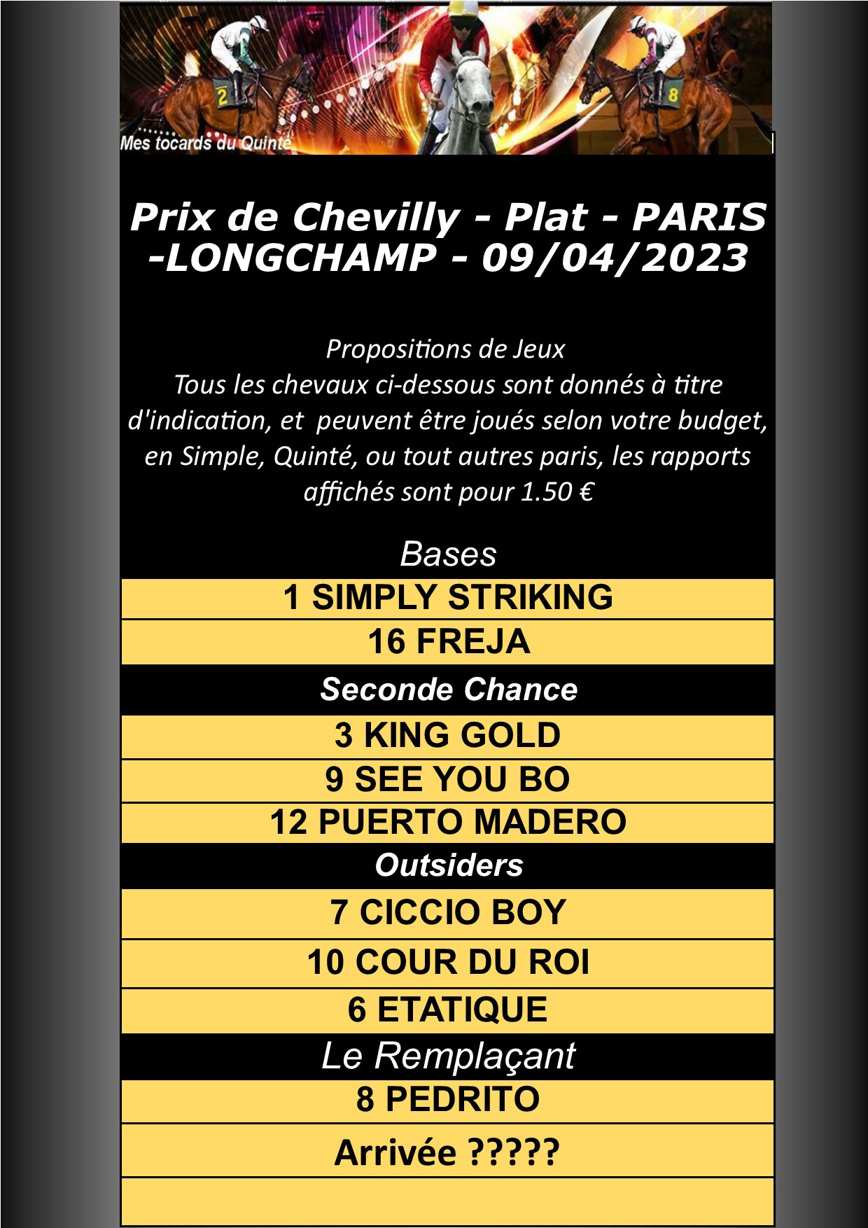 Prix de Chevilly - 16 Partants - PLAT, 1400 mètres , Corde à DROITE- HANDICAP DIVISE Pour chevaux entiers, hongres et juments de 4 ans et au-dessus . Un souvenir sera offert au propriétaire du cheval gagnant par FRANCE GALOP. NOUVELLE PISTE Prime Propriétaire : 80 % (2 & 3 ans), 55% (4 & 5 ans), 45 % (6 ans & au-dessus). |