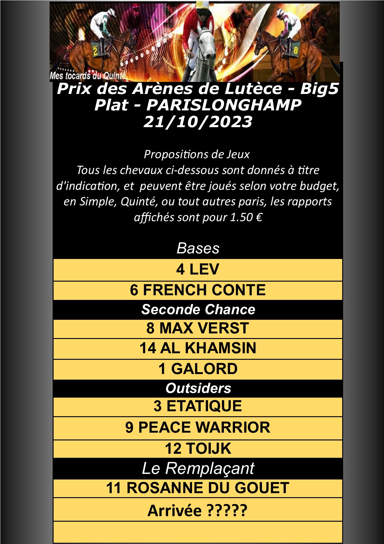 des Arènes de Lutèce - Big5 - Plat - PARISLONGHAMP - 21/10/2023 Départ 15h15 - Première épreuve - Plat - Classe 2 - Handicap divisé - Réf. : +17,5 +19 - 53 000€ - 1600m - 16 partants - Gazon - corde : à droite - Grande piste Pour chevaux entiers, hongres et juments de 3 ans et au-dessus. |