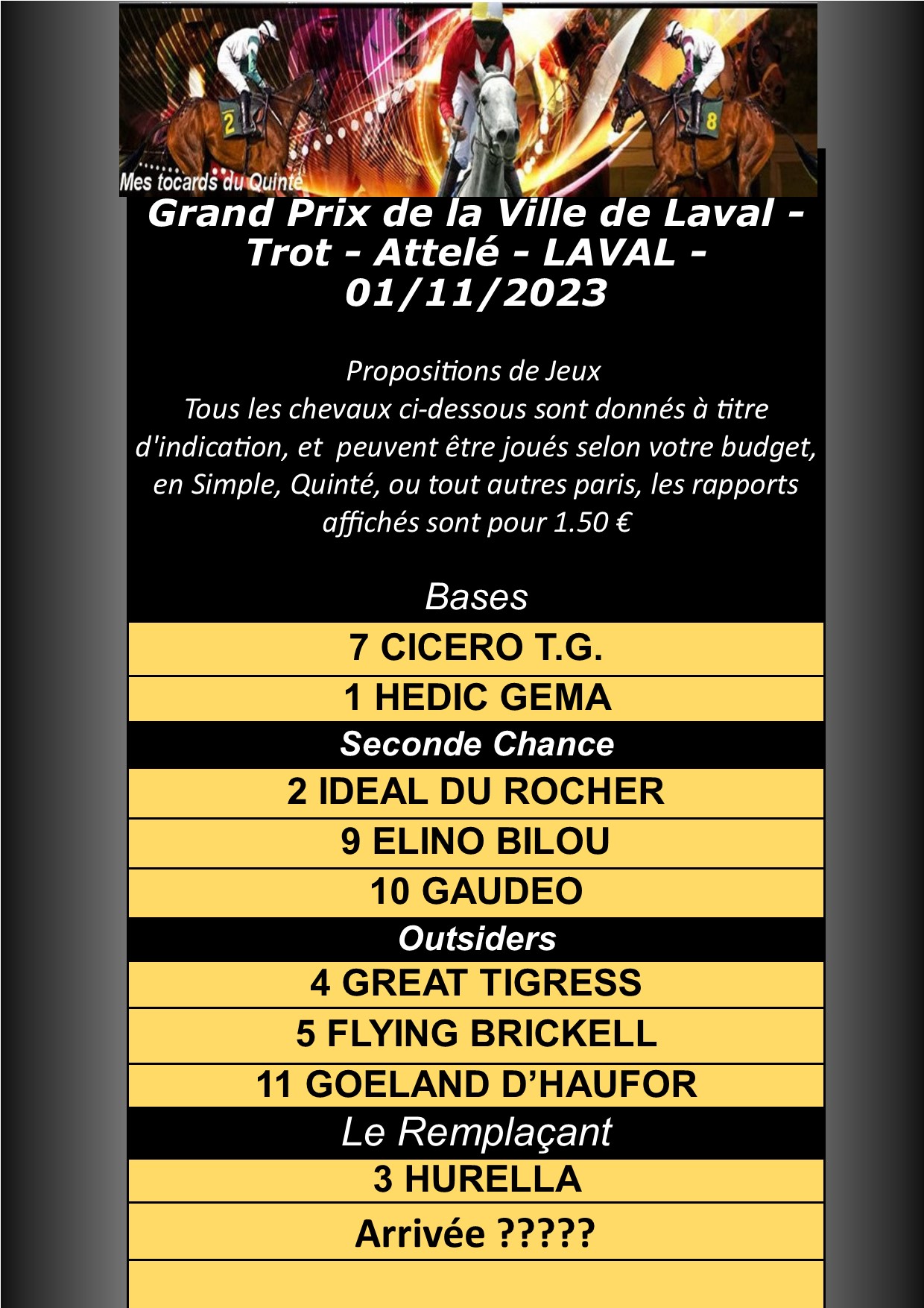 Prix de la Ville de Laval - Trot - Attelé - LAVAL - 01/11/2023 Départ 15h15 - Attelé - Européenne - Course A (trot) - 70 000€ - 2850m 16 partants - Sable - corde : à gauche Pour 5 à 10 ans inclus, n'ayant pas gagné 575.000. - Recul de 25 m. à 244.000. Sont seules admises à driver les personnes ayant gagné au moins dix courses (en étant titulaire d'une autorisation de monter à titre professionnel). |